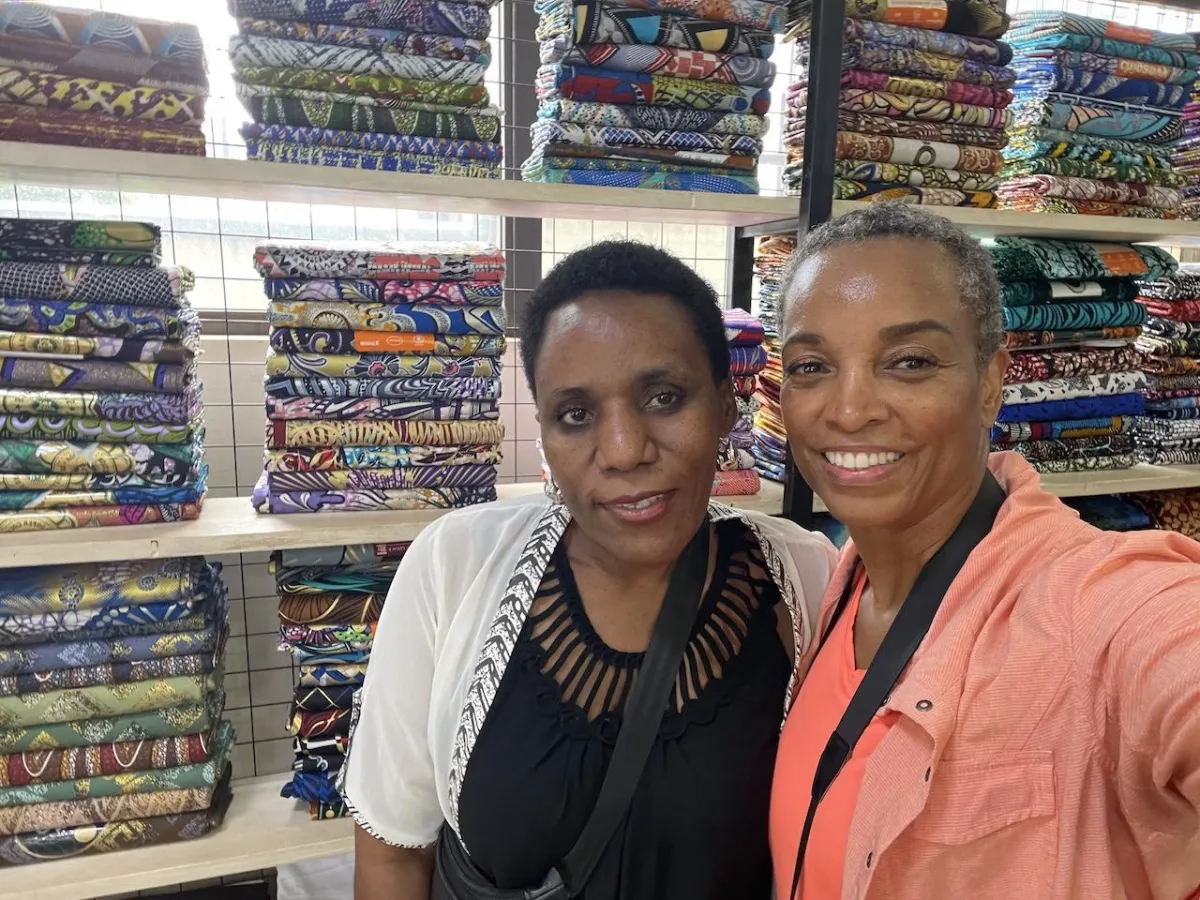The fabrics in my quilts come from my travels to Ghana where I personally select each piece from local vendors at the Makola Market in Accra, as well as luxury stores like Vlisco and Woodin, known for their high-end African wax print fabrics and new collections. There's also a Ghanaian fabric I purchased in Kampala, Uganda at Edro Designs.